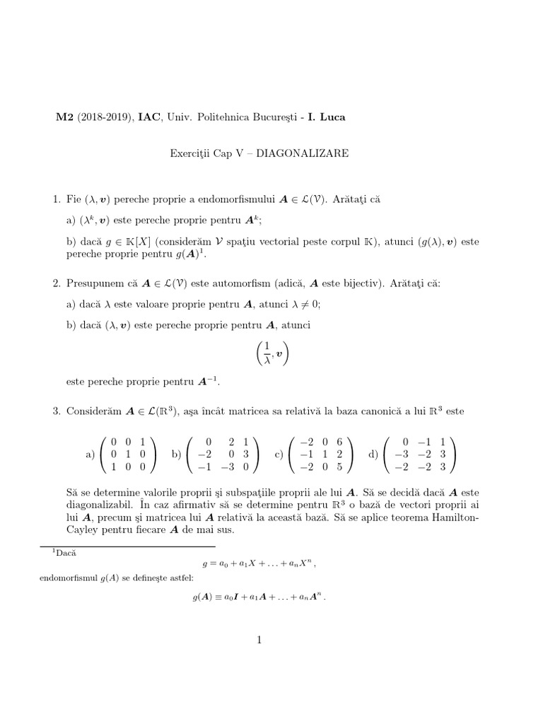 1. Fie (λ, v) pereche proprie a endomorfismului A ∈ L(V). Arătaţi că