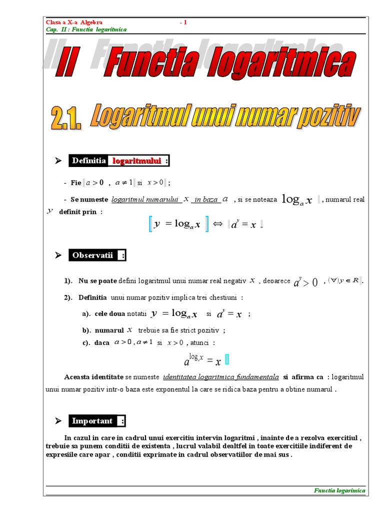 1). Nu se poate defini logaritmul unui numar real negativ , deoarece , y R .