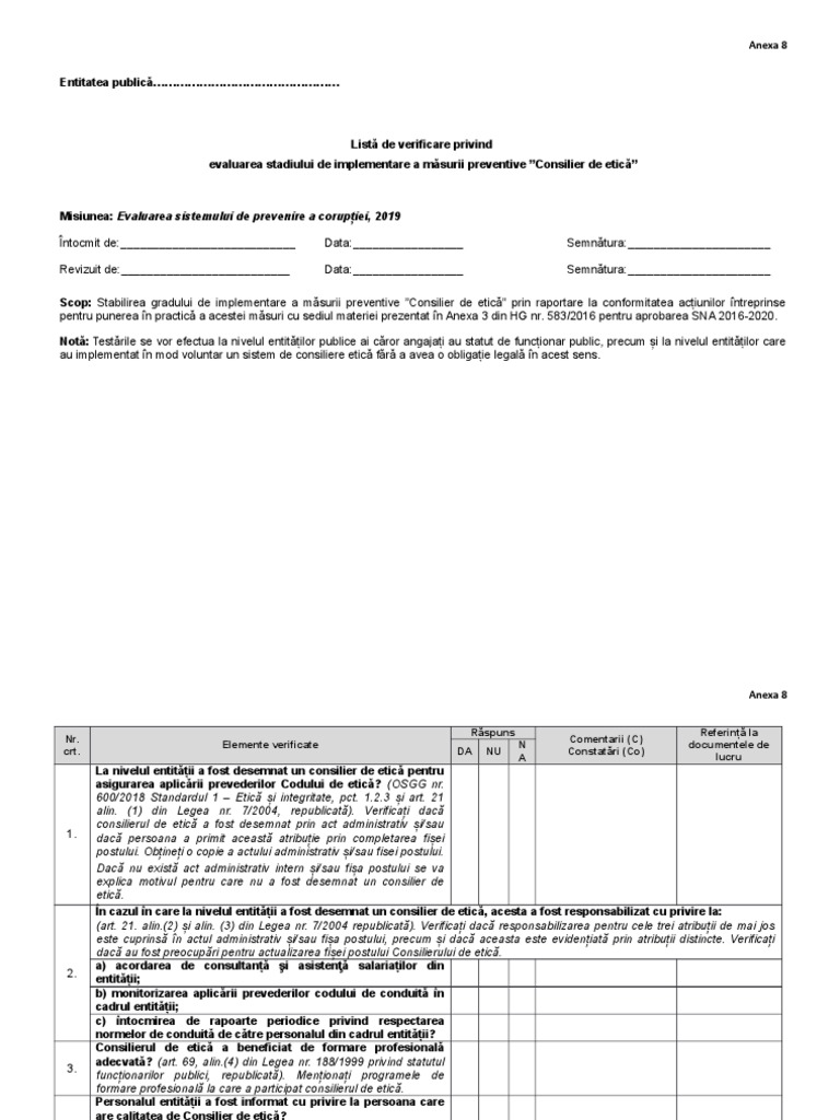 Scop: Stabilirea gradului de implementare a măsurii preventive ”Consilier de etică” prin raportare la conformitatea acțiunilor întreprinse