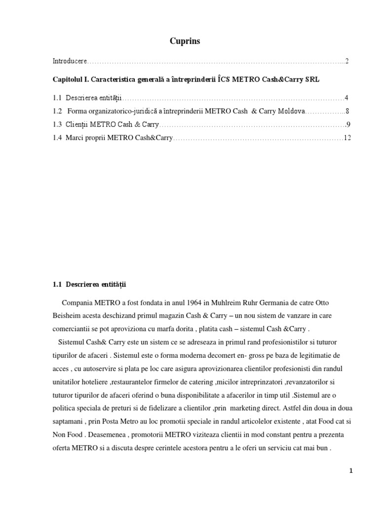 Capitolul I. Caracteristica generală a întreprinderii ÎCS METRO Cash&Carry SRL