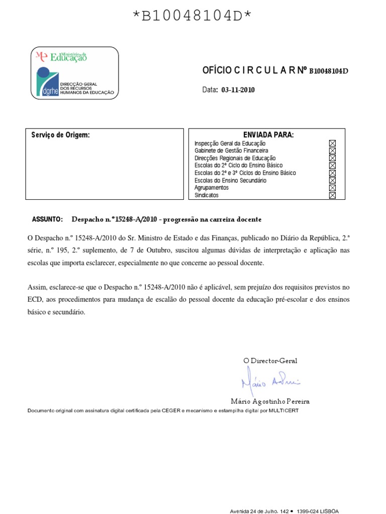 O Despacho n.º 15248-A/2010 do Sr. Ministro de Estado e das Finanças, publicado no Diário da República, 2.ª