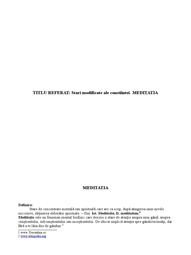 TITLU REFERAT: Stari modificate ale constiintei- MEDITATIA