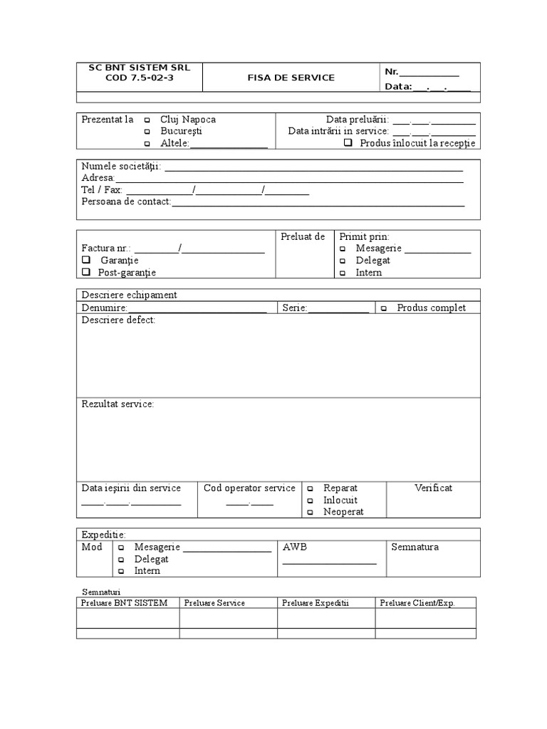 Bucureşti Data intrării in service: ___.___.________