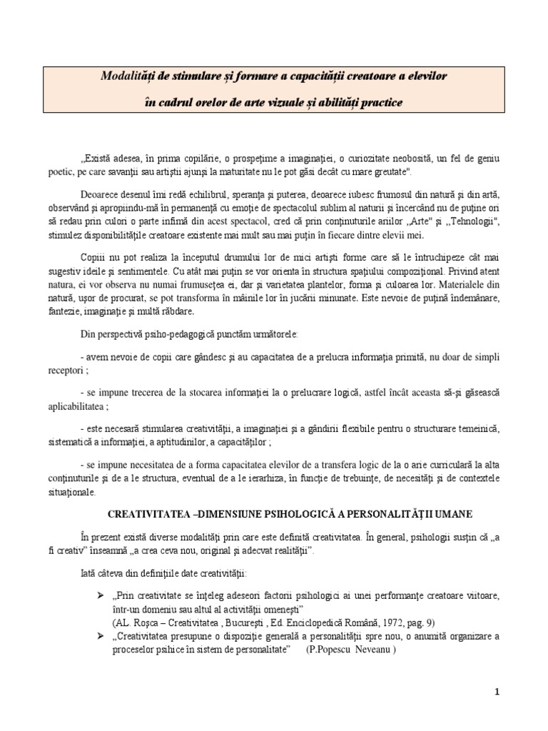 a creativităţii în predarea – învăţarea conţinuturilor disciplinelor Educaţie plastică şi Abilităţi practice.