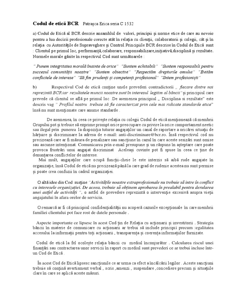 Codul de etică BCR Patrașca Erica seria C 1532