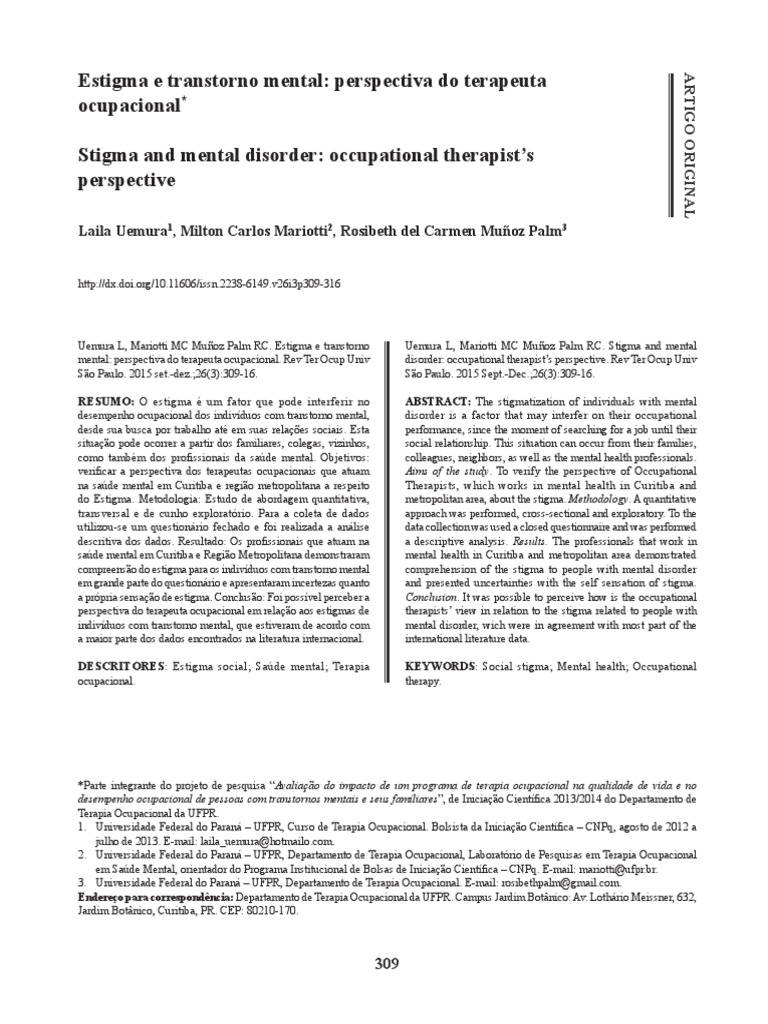 Uemura L, et al. Estigma e transtorno mental: perspectiva do terapeuta ocupacional. Rev Ter Ocup Univ São Paulo. 2015 set.-dez.;26(3):309-16.