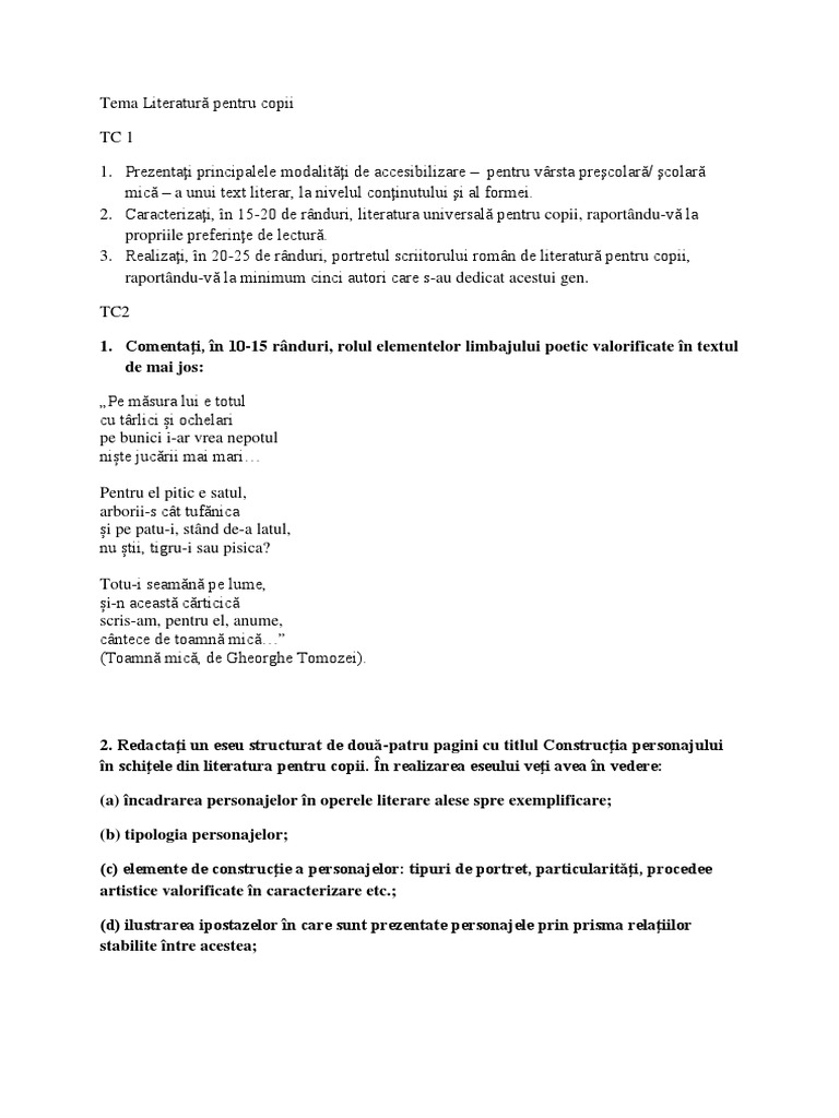 literatura pentru copii. În realizarea eseului veţi avea în vedere: