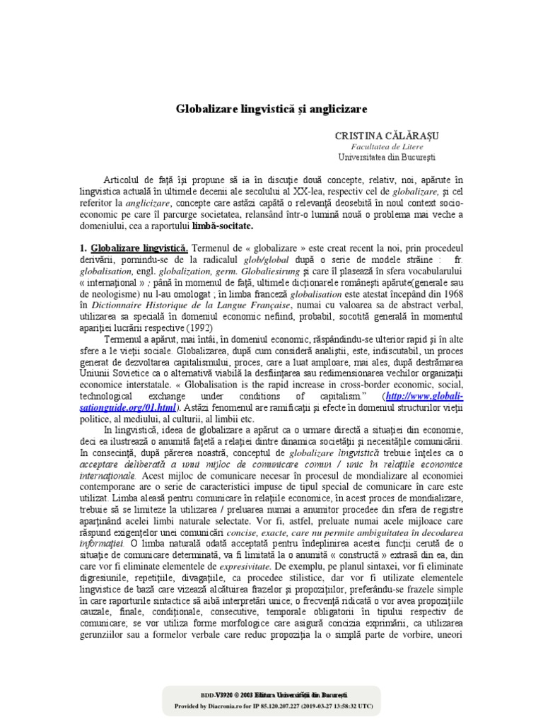 1. Globalizare lingvistică. Termenul de « globalizare » este creat recent la noi, prin procedeul