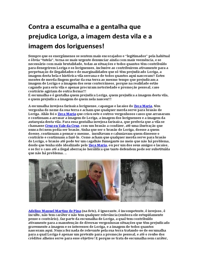 pessoais e do seu estúpido ego, sempre preocupado em agradar a Deus e ao diabo, atuando sempre como camaleão e catavento. A verdade é que está literalmente cagando para a sua terra e que por isso contribui para a perpetuação de alguns dos graves problemas de Loriga, e insulta as vitimas da sua inveja e do seu roubo, loriguenses que têm mais caráter, mais cultura e mais competência, e que sempre lutaram desinteressadamente para resolver esses mesmos problemas! Defende a ilegal aberração heráldica que não é, nunca foi nem jamais poderá ser o brasão de Loriga, e roi-se de inveja por o Senhor António Conde ter desenhado vários brasões e porque os mesmos têm a aprovação das entidades legais competentes, são considerados a heráldica ideal para esta vila, e por um deles estar em uso!! Além disso o historiador António Conde esteve envolvido desde o início no processo da regularização da heráldica de Loriga, facto que contribuiu fortemente para o transformar num alvo desta escumalha invejosa. E como esta escumalha invejosa não tem capacidade para