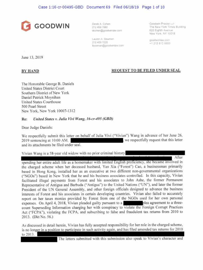 We respectfully submit this letter on behalf of Julia Vivi ("Vivian") Wang in advance of her June 26,