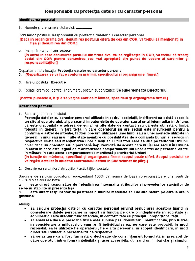 Denumirea postului: Responsabil cu protecția datelor cu caracter personal