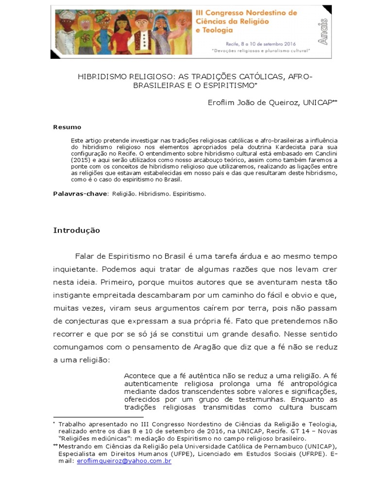 Palavras-chave: Religião. Hibridismo. Espiritismo.