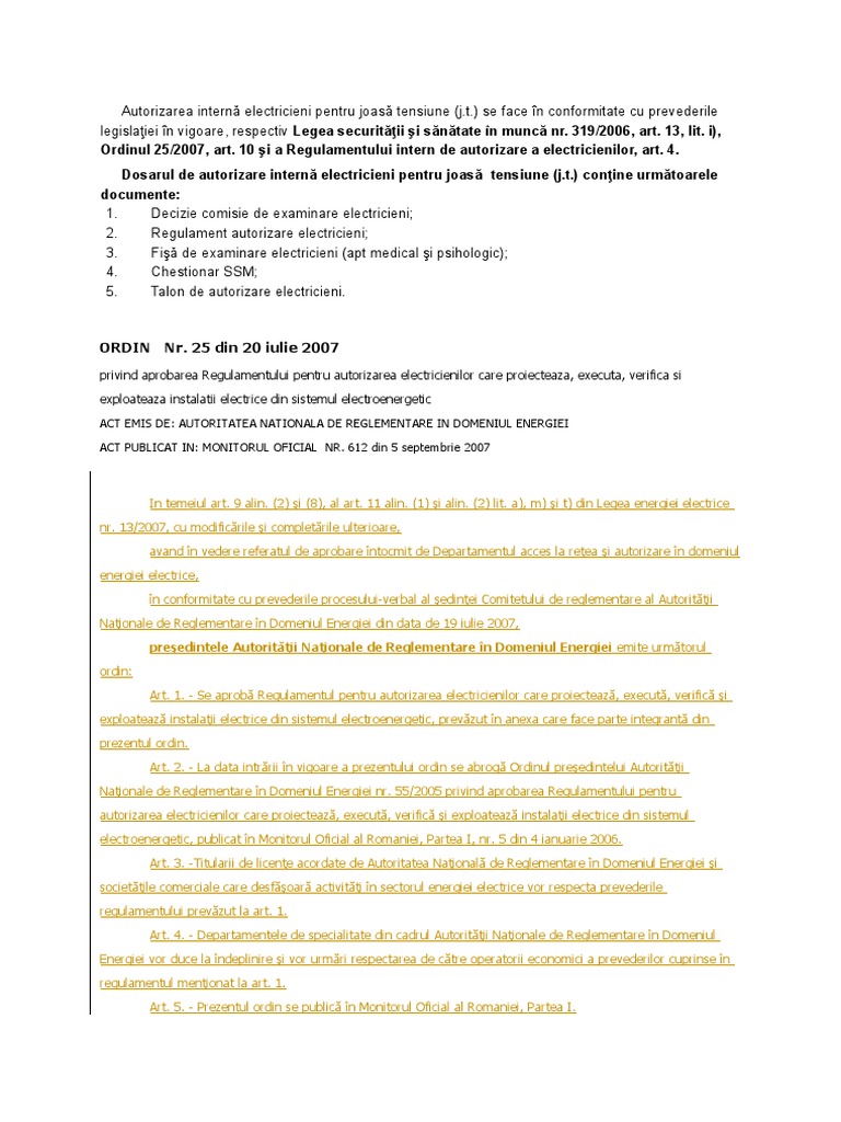 autorizarea electricienilor care proiectează, execută, verifică şi exploatează instalaţii electrice din sistemul