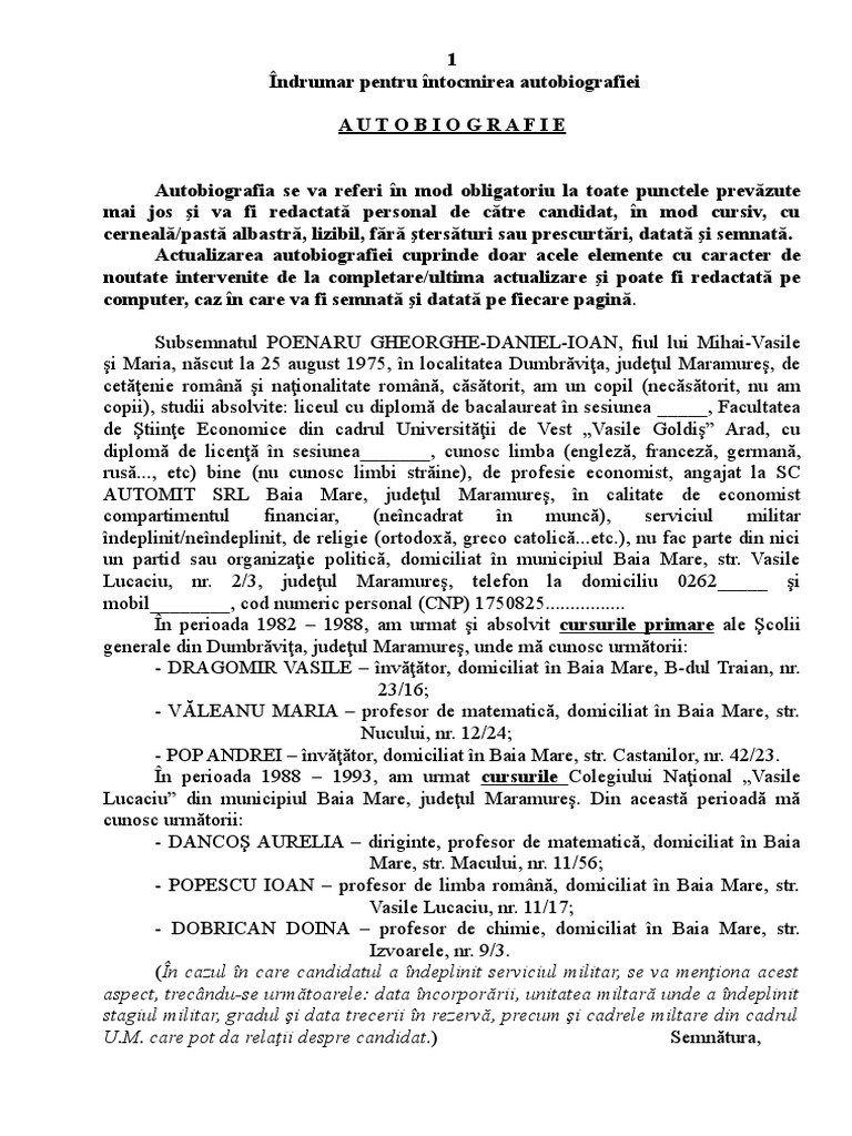 Autobiografia se va referi în mod obligatoriu la toate punctele prevăzute