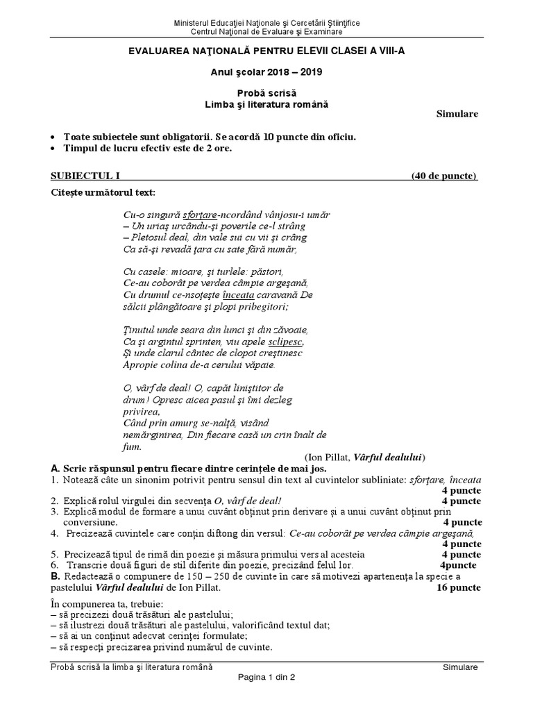 textului – 2 p; registrul de comunicare, stilul şi vocabularul adecvate conţinutului – 2 p; ortografia – 3 p;
