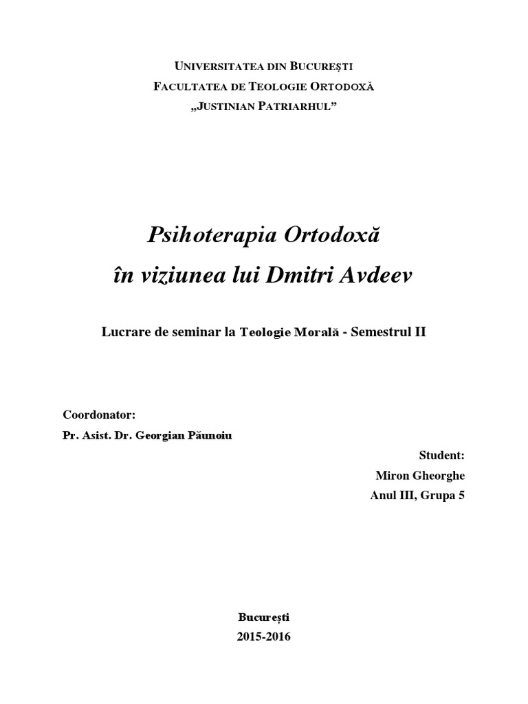 Dr. Dimitri Aleksandrovici AVDEEV, Probleme actuale ale psihoterapiei ortodoxe, traducere din limba rusă de