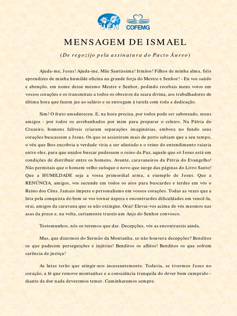 (Recebida em sessão ordinária do Grupo Ismael da FEB, pelo médium Olympio Giffoni, na