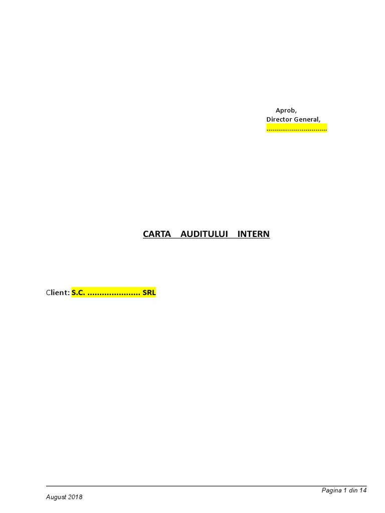 Prin Carta de Audit Intern elaborata de auditorul intern pentru a S.C. ............ SRL, denumita in