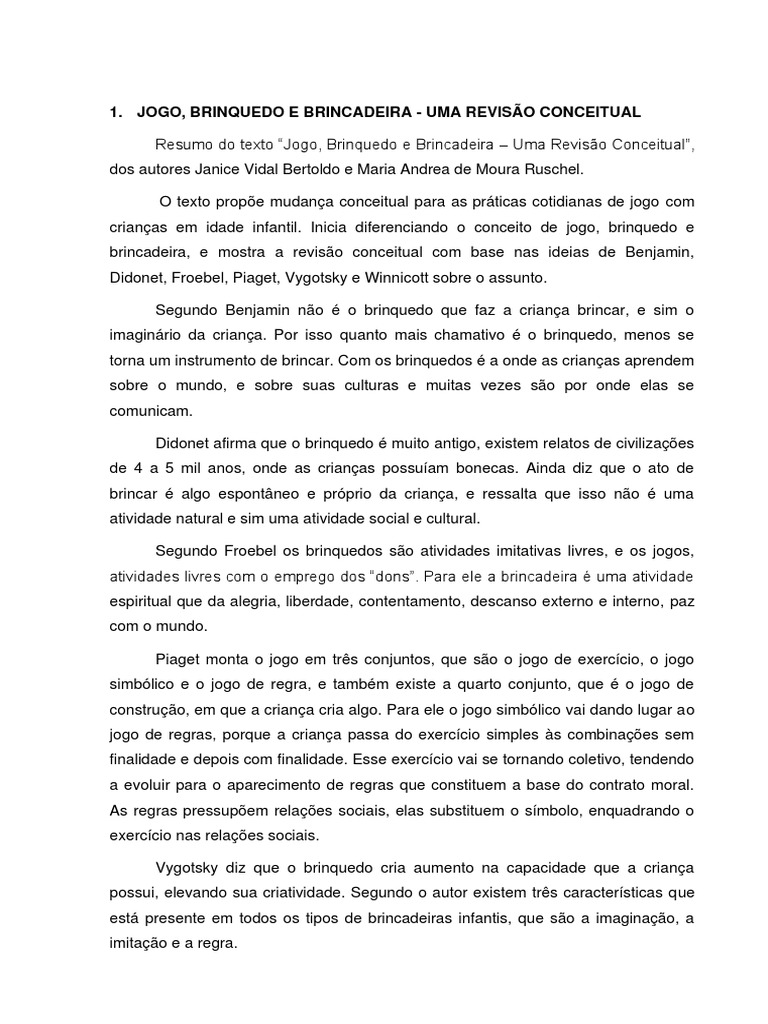 Resumo do texto “Jogo, Brinquedo e Brincadeira – Uma Revisão Conceitual”,