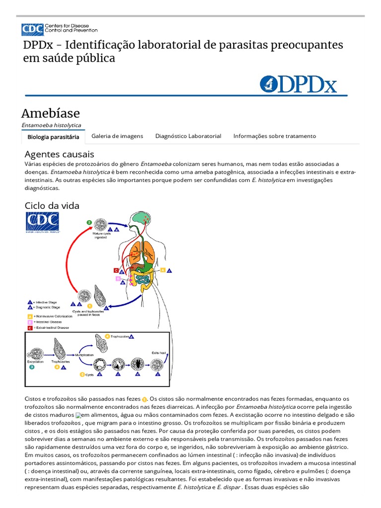 liberados trofozoítos , que migram para o intestino grosso. Os trofozoítos se multiplicam por ssão binária e produzem cistos , e os dois estágios são passados nas fezes. Por causa da proteção conferida por suas paredes, os cistos podem sobreviver dias a semanas no ambiente externo e são responsáveis pela transmissão. Os trofozoítos passados nas fezes são rapidamente destruídos uma vez fora do corpo e, se ingeridos, não sobreviveriam à exposição ao ambiente gástrico. Em muitos casos, os trofozoítos permanecem con nados ao lúmen intestinal ( : infecção não invasiva) de indivíduos portadores assintomáticos, passando por cistos nas fezes. Em alguns pacientes, os trofozoítos invadem a mucosa intestinal ( : doença intestinal) ou, através da corrente sanguínea, locais extra-intestinais, como fígado, cérebro e pulmões (: doença extra-intestinal), com manifestações patológicas resultantes. Foi estabelecido que as formas invasivas e não invasivas representam duas espécies separadas, respectivamente E. histolytica e E. dispar . Essas duas espécies são