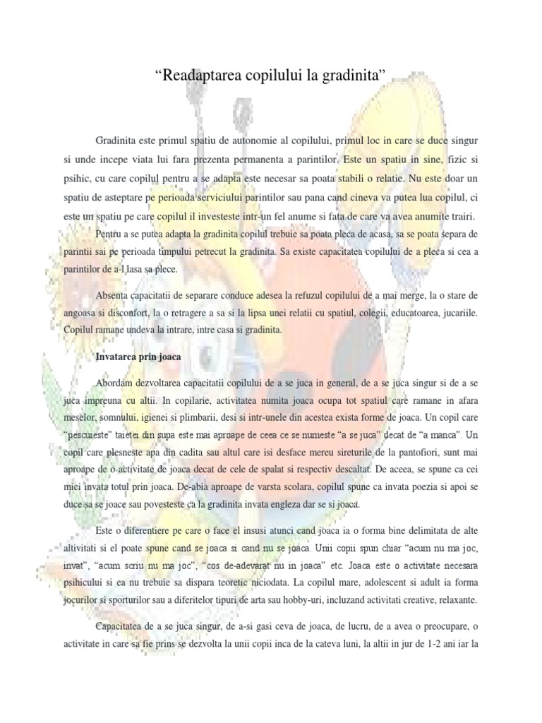 parintii sai pe perioada timpului petrecut la gradinita. Sa existe capacitatea copilului de a pleca si cea a