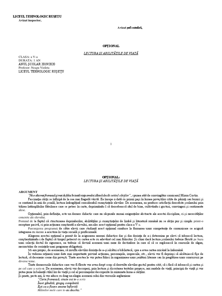 Curriculum la decizia şcolii: Lectura şi abilităţile de viaţă