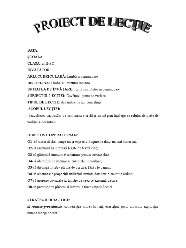 SUBIECTUL LECŢIEI: Cuvântul –parte de vorbire