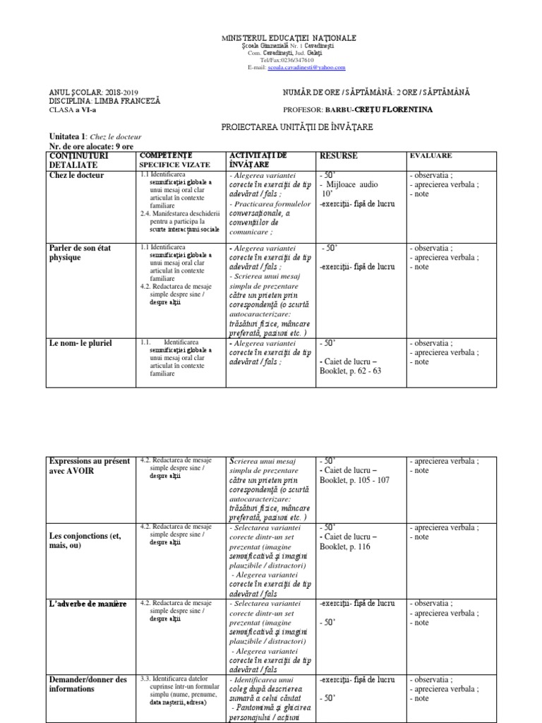 ANUL ŞCOLAR: 2018-2019 NUMĂR DE ORE / SĂPTĂMÂNĂ: 2 ORE / SĂPTĂMÂNĂ