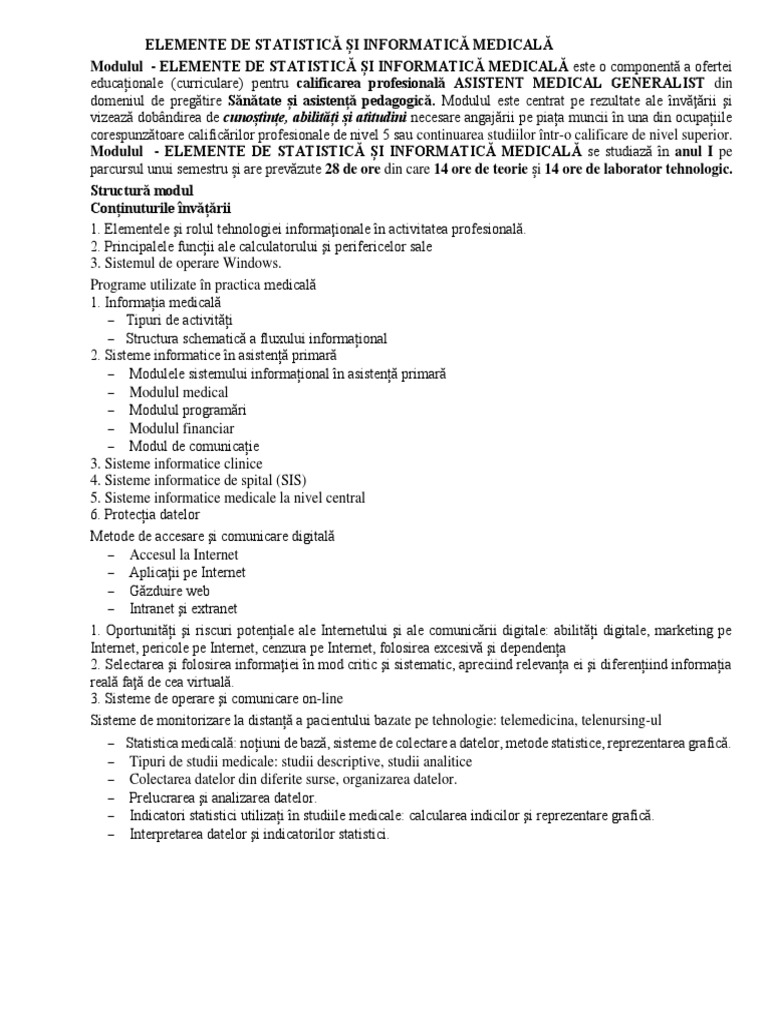 Modulul - ELEMENTE DE STATISTICĂ ȘI INFORMATICĂ MEDICALĂ este o componentă a ofertei