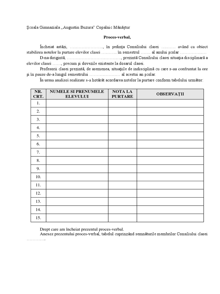 stabilirea notelor la purtare elevilor clasei ……….. în semestrul ……. al anului şcolar ………………