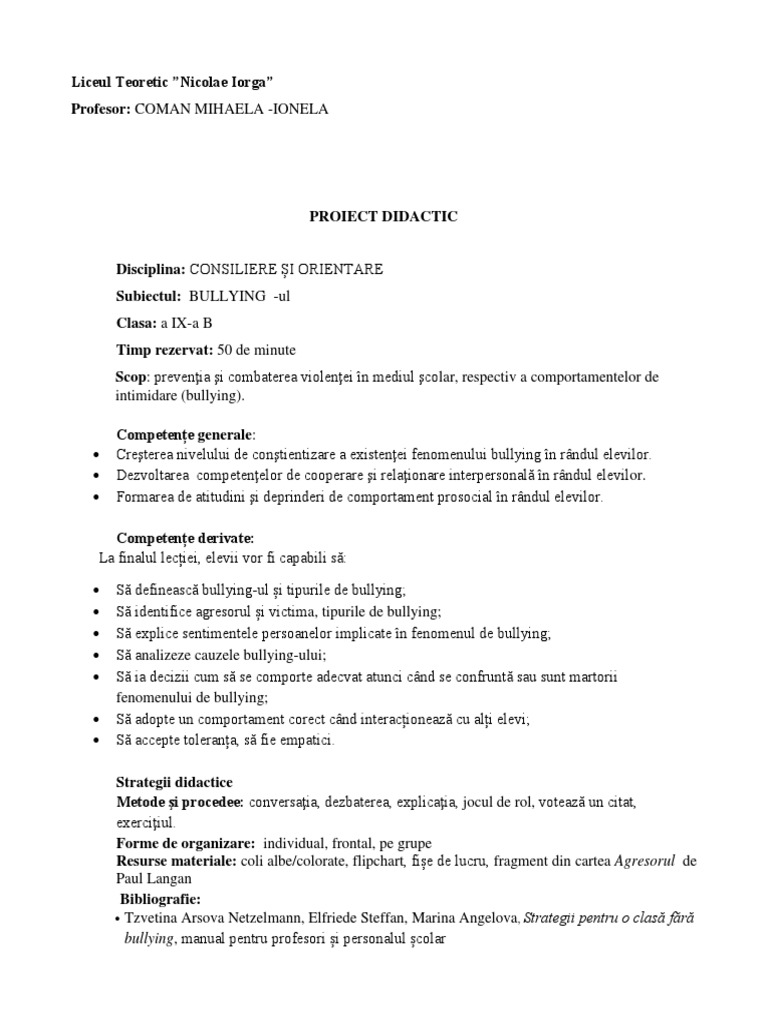 Astfel, cadrul didactic identifică și definește comportamentul de bullying (roluri, tipuri,