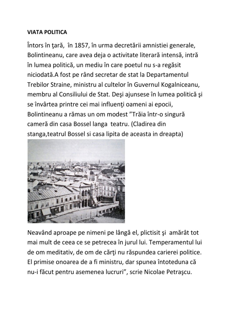 Bolintineanu a rămas un om modest ”Trăia într-o singură
