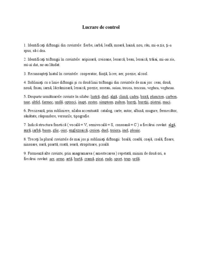 4. Subliniaţi cu o linie diftongii şi cu două linii triftongii din cuvintele de mai jos: ceas, două,