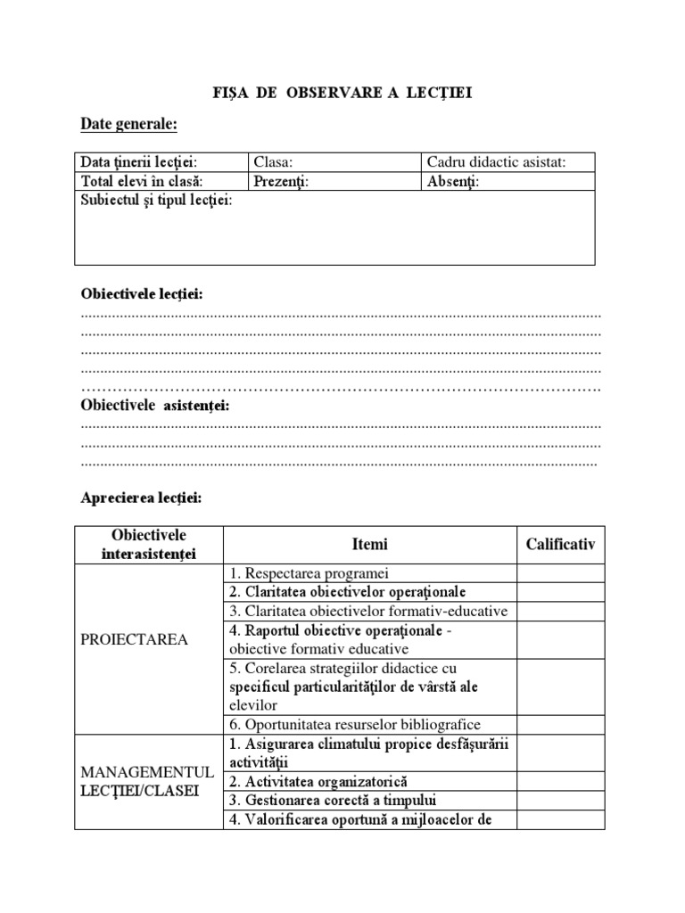 Data ţinerii lecţiei: Clasa: Cadru didactic asistat: