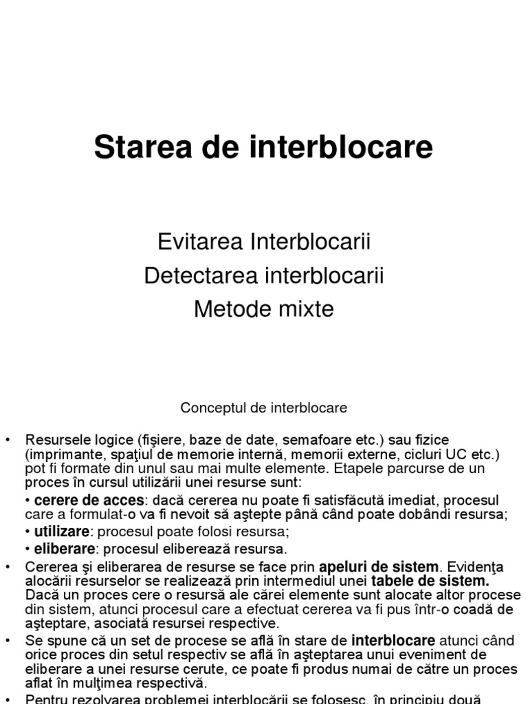 • Se spune că un set de procese se află în stare de interblocare atunci când