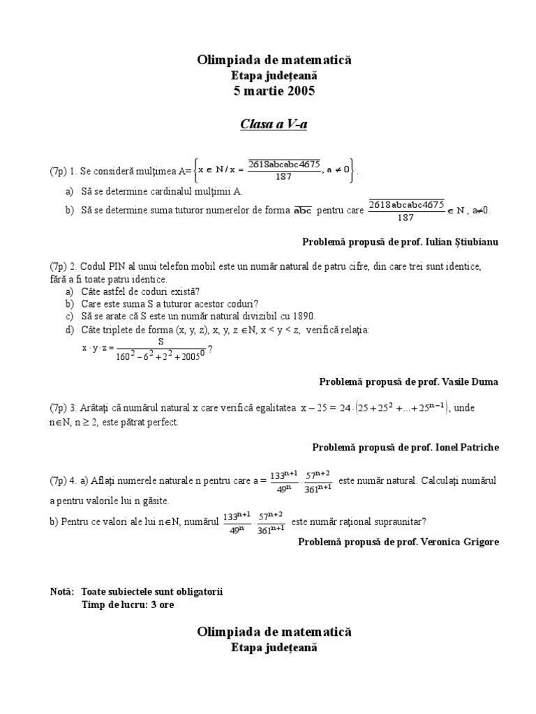(7p) 2. Codul PIN al unui telefon mobil este un număr natural de patru cifre, din care trei sunt identice,