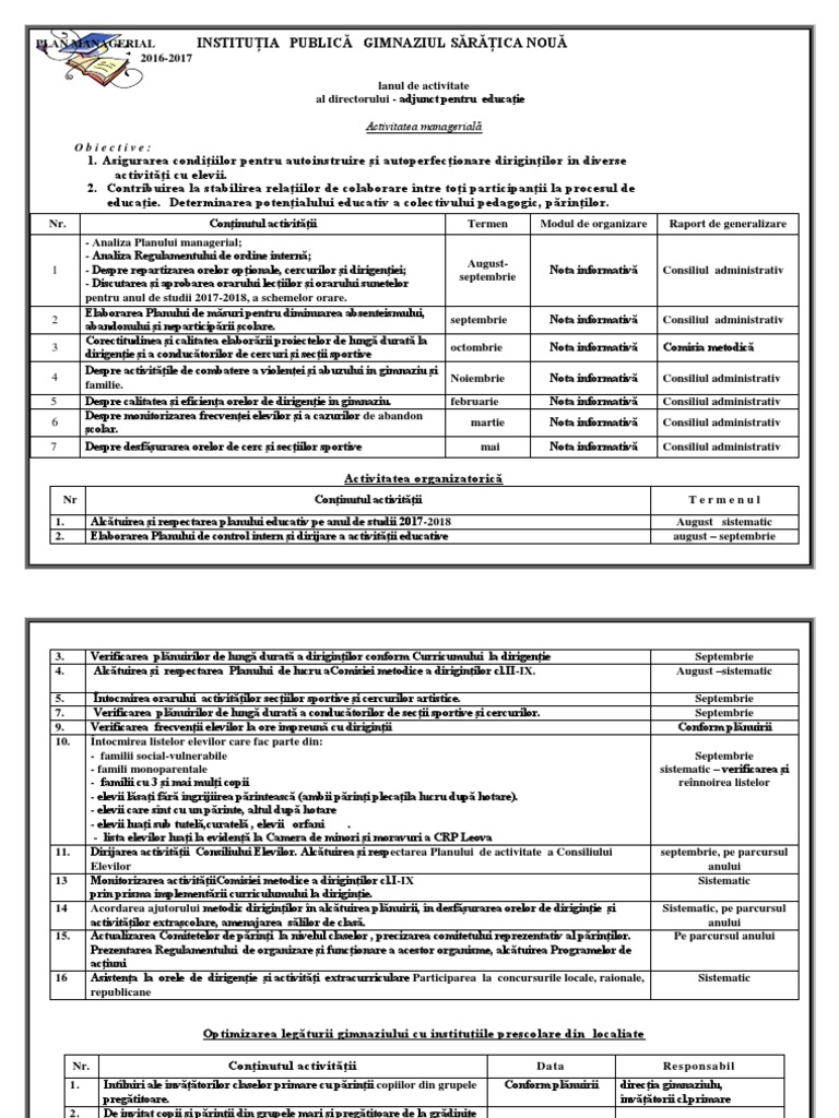 PLAN MANAGERIAL INSTITUȚIA PUBLICĂ GIMNAZIUL SĂRĂȚICA NOUĂ