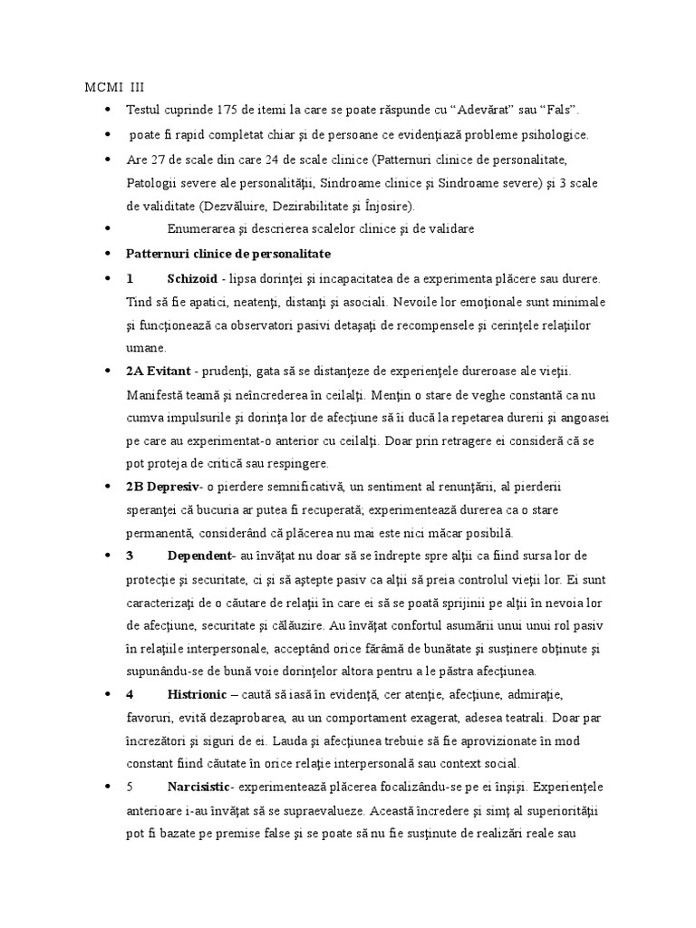 Are 27 de scale din care 24 de scale clinice (Patternuri clinice de personalitate,