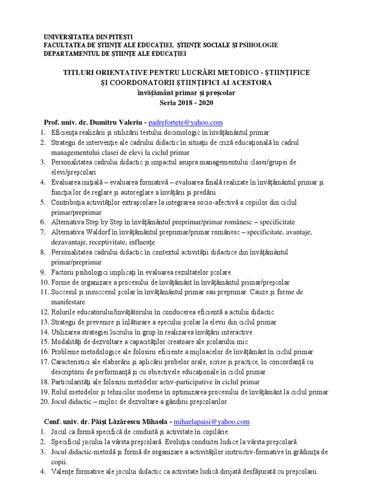TITLURI ORIENTATIVE PENTRU LUCRĂRI METODICO - ŞTIINŢIFICE