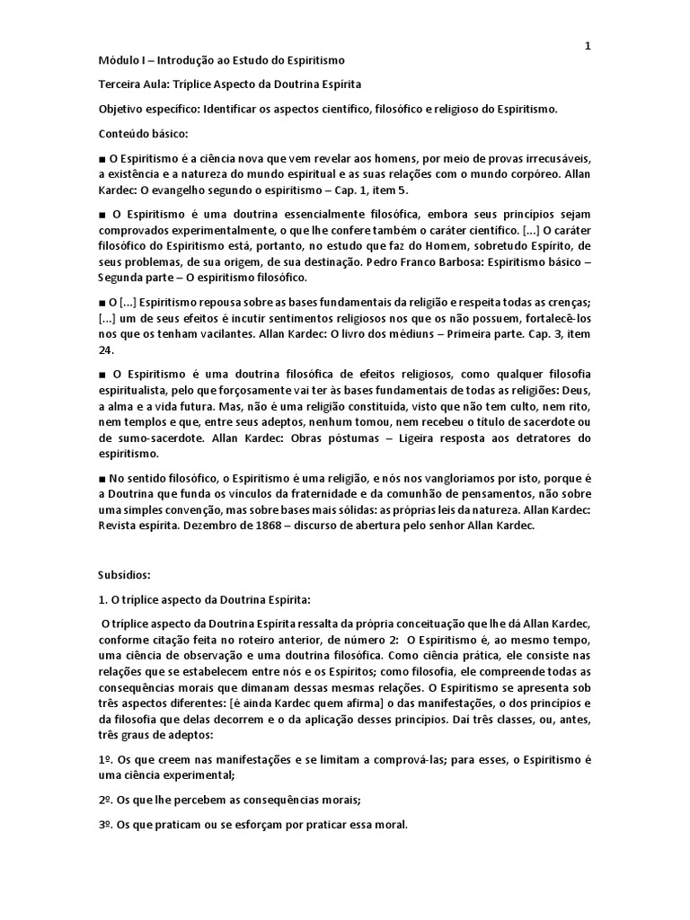 Terceira Aula: Tríplice Aspecto da Doutrina Espírita