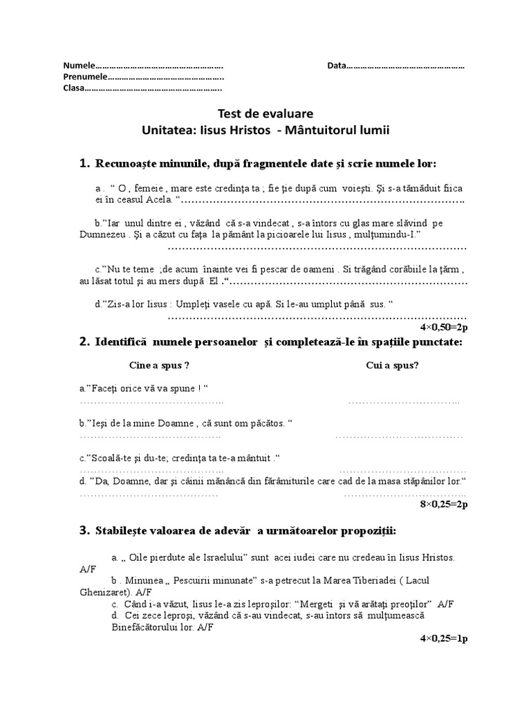 date; c. Iisus Hristos – leprosului 0,25 × 8 2 p