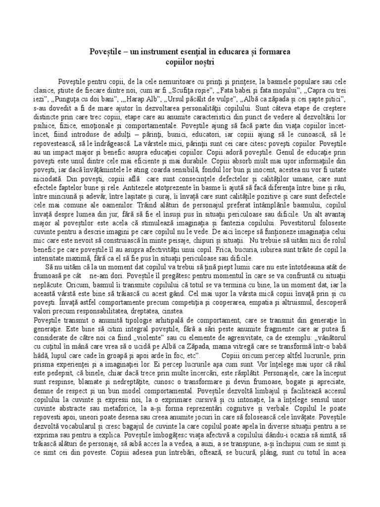 demne de respect şi un bun model comportamental. Poveștile dezvoltă limbajul și facilitează accesul
