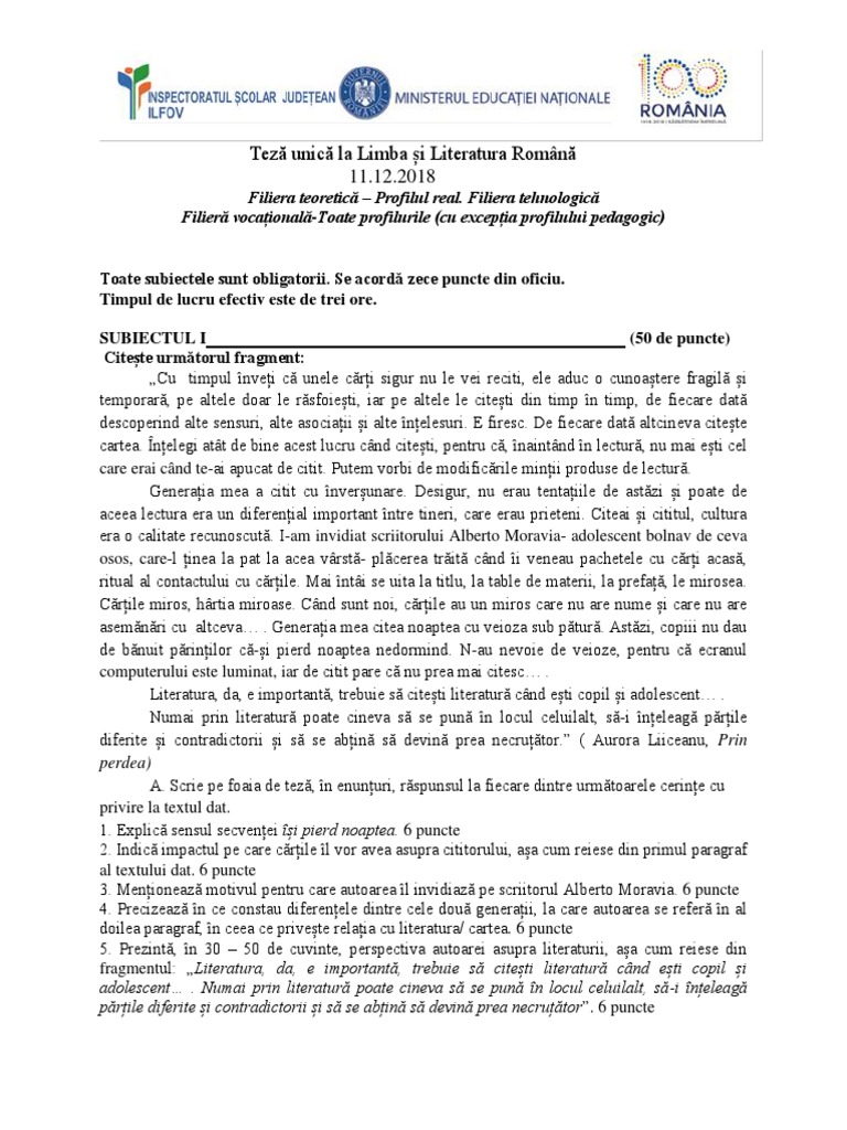 În vederea acordării punctajului pentru redactare, răspunsul trebuie să aibă minimum 50