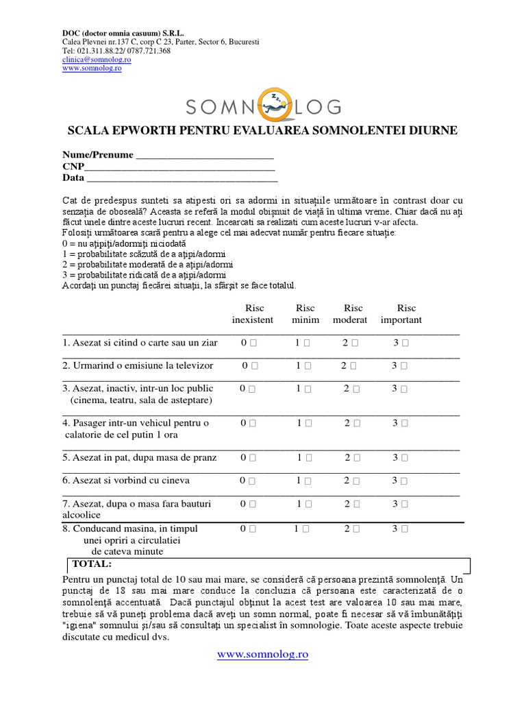 somnolenţă accentuată. Dacă punctajul obţinut la acest test are valoarea 10 sau mai mare,