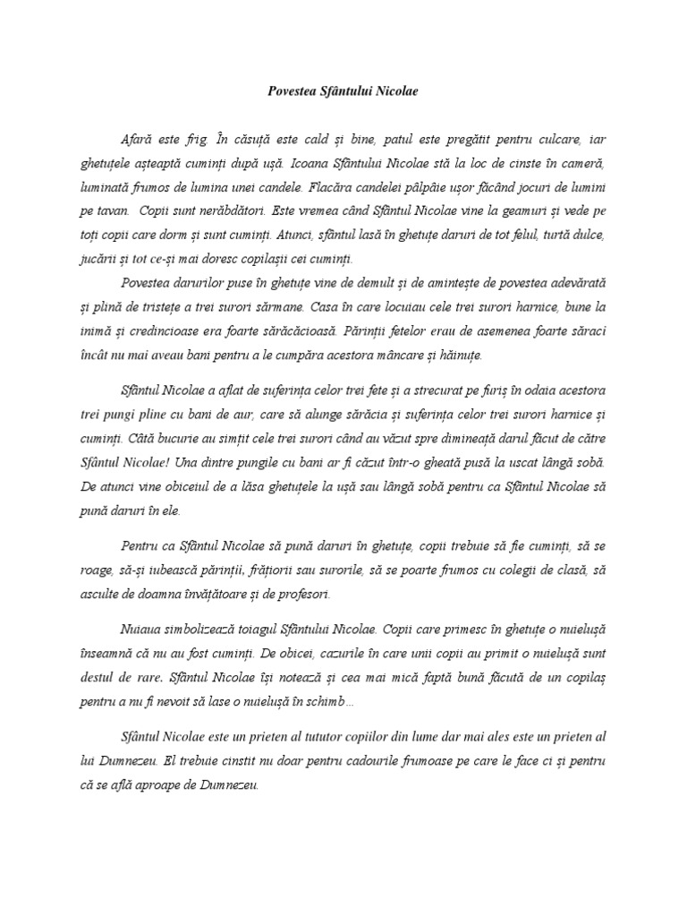 toți copii care dorm și sunt cuminți. Atunci, sfântul lasă în ghetuțe daruri de tot felul, turtă dulce,