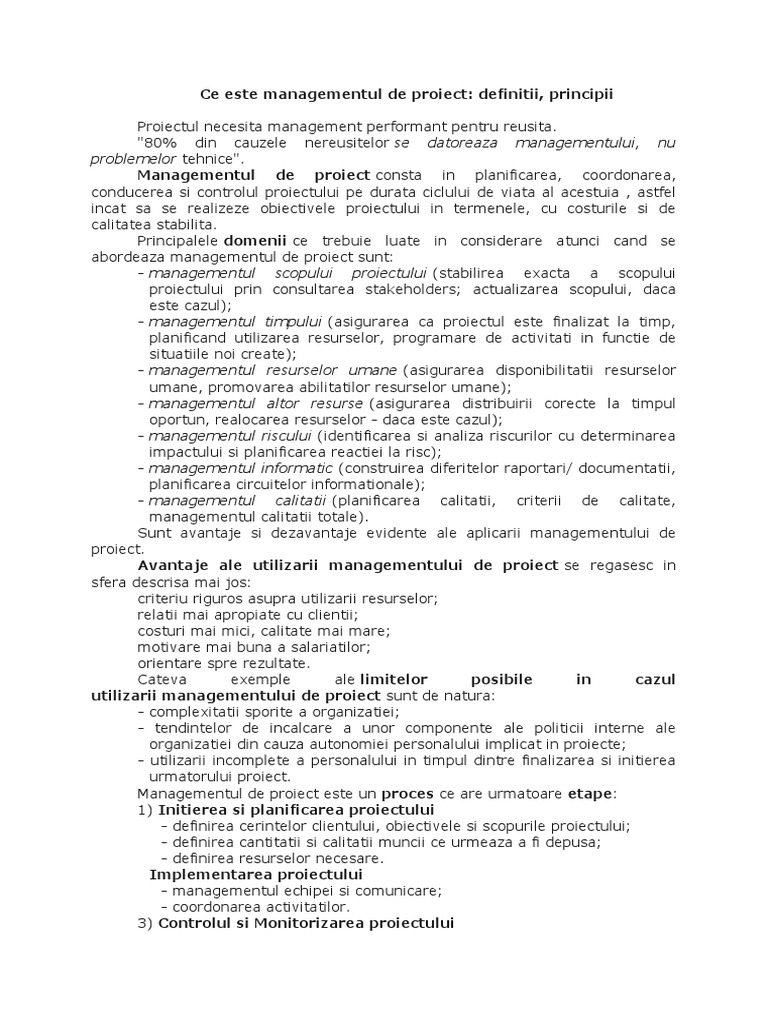 - managementul scopului proiectului (stabilirea exacta a scopului