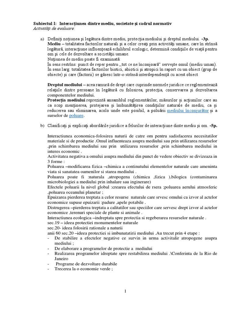 Subiectul I: Interacțiunea dintre mediu, societate şi cadrul normativ