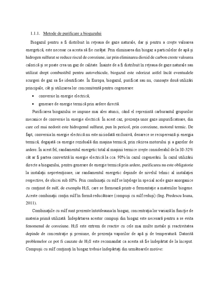 directe a biogazului, pentru generare de energie termică prin ardere, purificarea nu este obligatorie