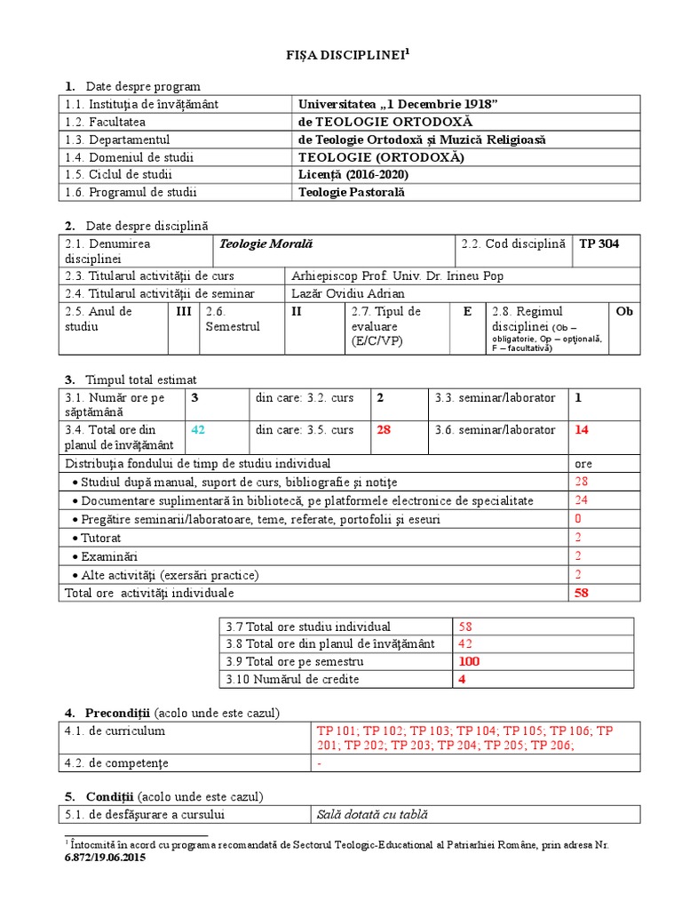 2.1. Denumirea Teologie Morală 2.2. Cod disciplină TP 304