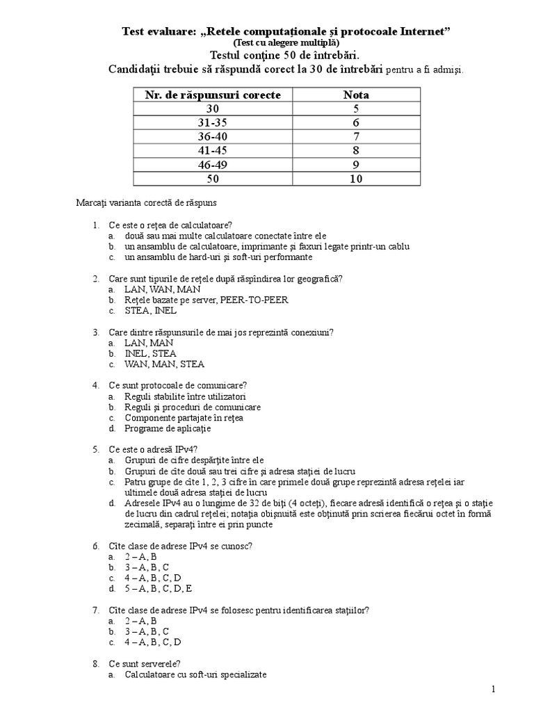 Test evaluare: „Retele computaţionale şi protocoale Internet”